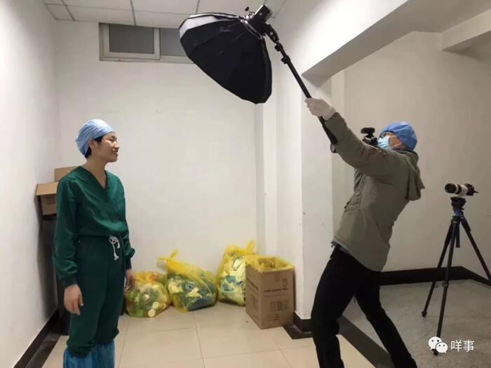 鐘銳鈞說,在拍攝的兩天內(nèi),他一直守在漢口醫(yī)院的隔離區(qū)外,等到醫(yī)護(hù)人員出門便走上前去,讓每個(gè)人只停留一分鐘,一手舉燈一手持相機(jī)完成拍攝。