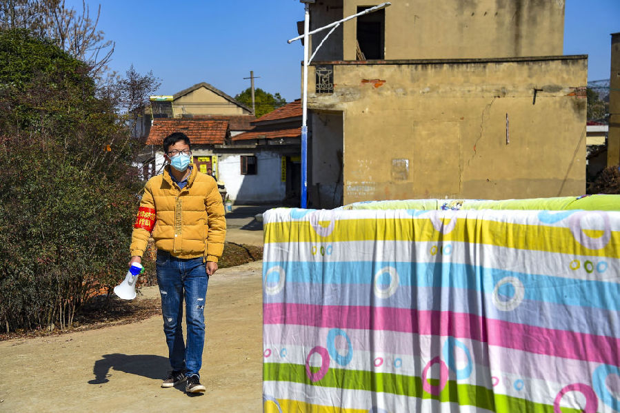 志愿者程浩在村莊來回播放錄音,提示村民注意防護(hù)。新華社記者 胡虎虎 攝