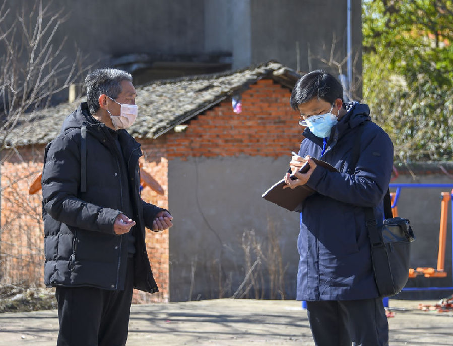 在浐川村通往邱畈村的檢查點,村民秦如康和另外兩人在這里“守卡”,對過往人員登記信息、測量體溫。記者翻看了最近3天的通行記錄,除鎮(zhèn)村干部、村醫(yī)和代購員進(jìn)出以外,沒有村民從這里通行。