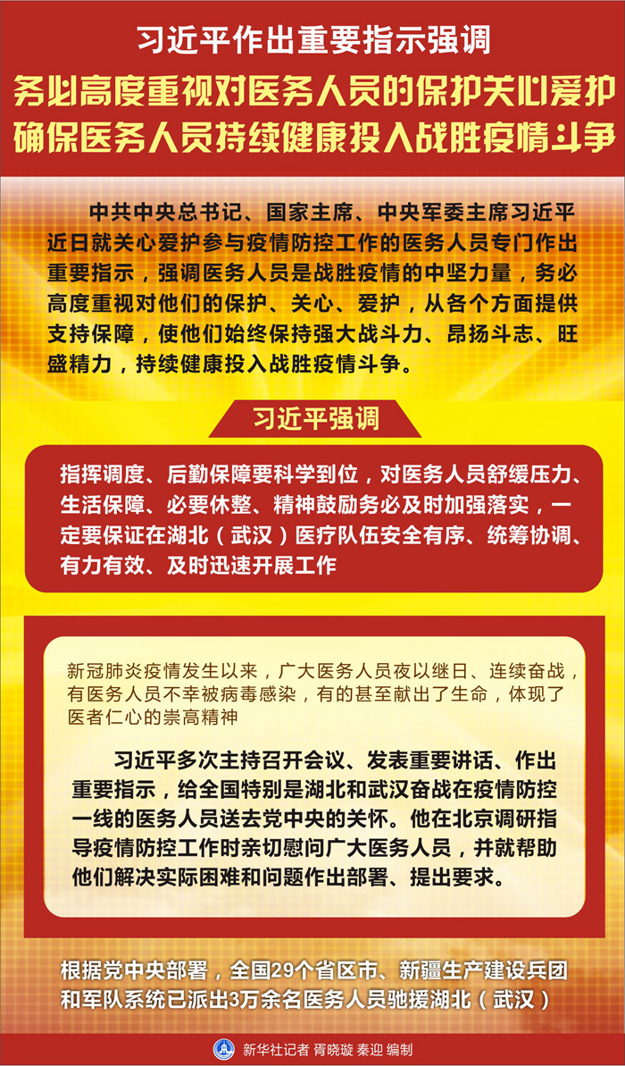 習近平強調,指揮調度、后勤保障要科學到位,對醫(yī)務人員舒緩壓力、生活保障、必要休整、精神鼓勵務必及時加強落實,一定要保證在湖北(武漢)醫(yī)療隊伍安全有序、統(tǒng)籌協(xié)調、有力有效、及時迅速開展工作。