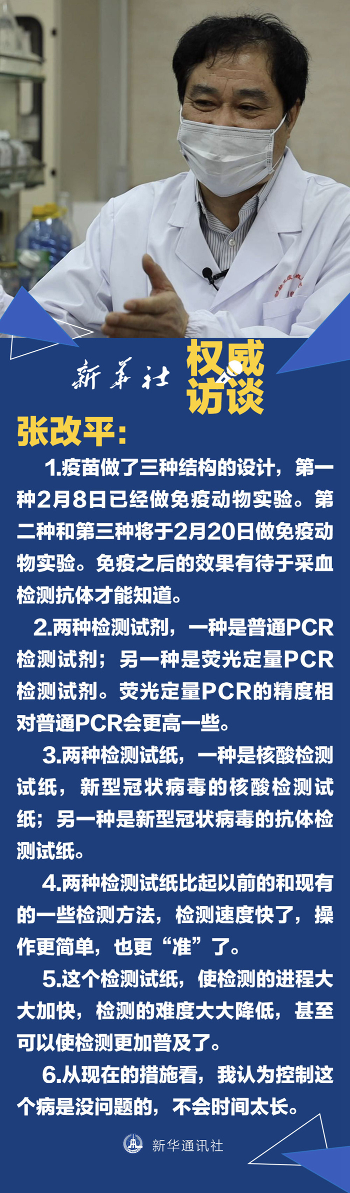這些階段性研究成果是什么?三分鐘就可快速檢測新冠病毒的檢測試紙準確率有多高?新冠病毒疫苗抗原的動物試驗效果如何?什么時間能夠推廣應(yīng)用?圍繞這些問題,新華社記者2月18日專訪了張改平院士。