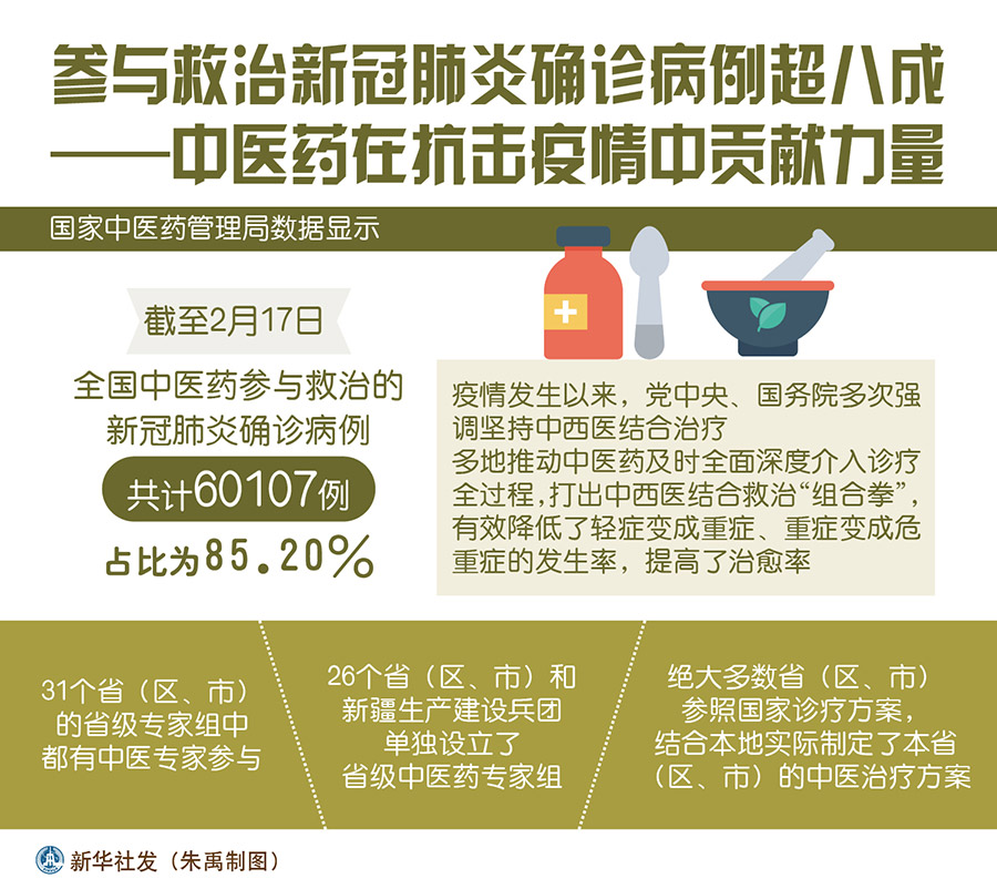 新華社北京2月20日電 題:參與救治新冠肺炎確診病例超八成——中醫(yī)藥在抗擊疫情中貢獻(xiàn)力量