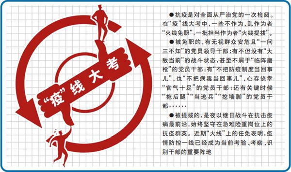 這次抗擊新冠肺炎疫情,是對全面從嚴(yán)治黨的一次檢閱,是領(lǐng)導(dǎo)干部政治素質(zhì)、宗旨意識、全局觀念、駕馭能力、擔(dān)當(dāng)精神的試金石、磨刀石?;鶎邮菆?zhí)政之基?!澳苷呱?、庸者下、劣者汰”,近期“火線”上的任免表明,疫情防控一線已經(jīng)成為當(dāng)前考驗、考察、識別干部的重要陣地。(案例來源:新華社、中央紀(jì)委國家監(jiān)委網(wǎng)站、中國紀(jì)檢監(jiān)察報、湖北日報等 記者黃海波、劉婧宇)