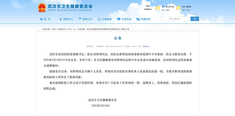 2月18日中午,武漢市衛(wèi)健委發(fā)布公告,武漢市武昌醫(yī)院黨委副書記、院長劉智明同志,在抗擊新型冠狀病毒肺炎疫情中不幸染病,經(jīng)全力救治無效,于2020年2月18日10:54分去世,享年51歲。