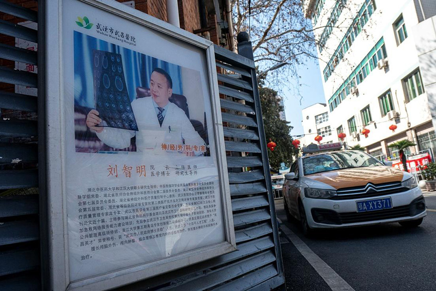 2月21日,劉智明院長的宣傳照依然掛在醫(yī)院樓下。(新華社記者熊琦攝)
