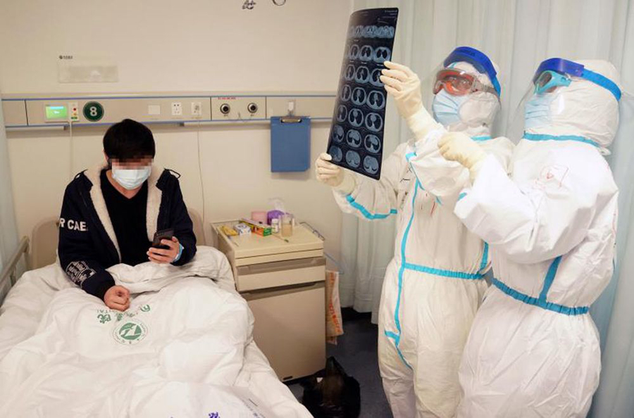 2月18日,專家趙建平(右二)與醫(yī)生周瑩在同濟醫(yī)院中法新城院區(qū)新冠肺炎重癥病區(qū),一起觀看患者的CT片。新華社記者王毓國 攝