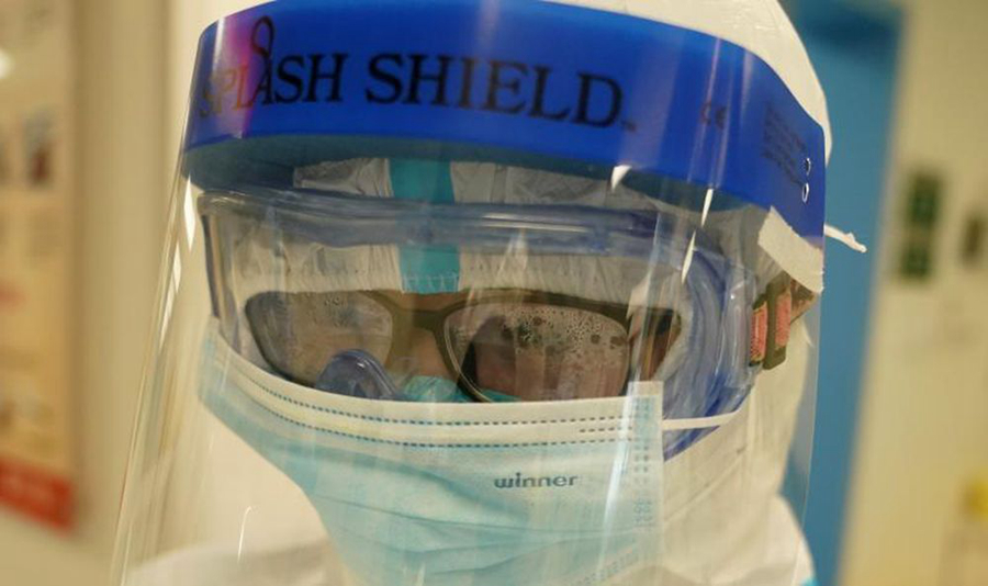 “全副武裝”的護士漆思河眼鏡里產(chǎn)生了大量水汽。新華社記者王毓國 攝
