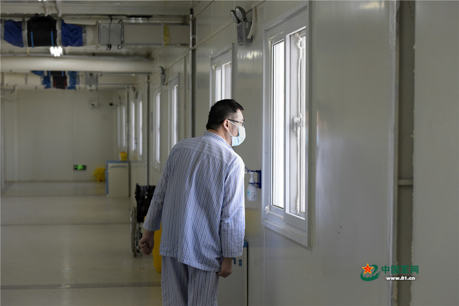 萬先生從窗口望向窗外,在病房,他期待自己早日康復(fù)出院。中國軍網(wǎng)記者范顯海 攝