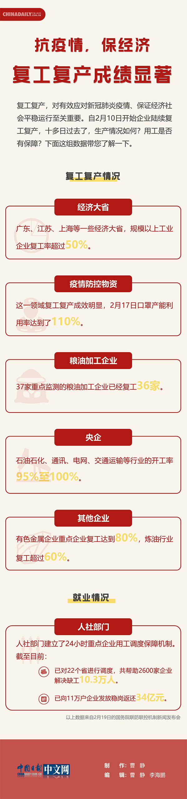 復(fù)工復(fù)產(chǎn),對有效應(yīng)對新冠肺炎疫情、保證經(jīng)濟社會平穩(wěn)運行至關(guān)重要。自2月10日開始企業(yè)陸續(xù)復(fù)工復(fù)產(chǎn),十多日過去了,生產(chǎn)情況如何?用工是否有保障?下面這組數(shù)據(jù)帶您了解一下。