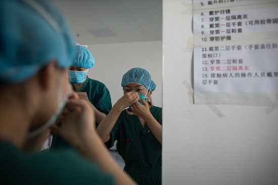 高峰、楊萍和王楠3位麻醉醫(yī)生早早就換上防護(hù)服在病房外等候。為了節(jié)省體力,也為了避免出汗,等候期間大家坐在凳子上一動(dòng)不動(dòng),有如雕像?!胺雷o(hù)服不透氣,穿上去很熱,會(huì)出汗,水蒸氣會(huì)在護(hù)目鏡上凝結(jié)起霧,影響視線。”為他們檢查防護(hù)服的感染科護(hù)士表示,每個(gè)人的護(hù)目鏡上都不可避免會(huì)起霧,在病區(qū)時(shí)間長(zhǎng)了,容易出汗的醫(yī)生,再怎么除霧處理,護(hù)目鏡上都會(huì)滴水。