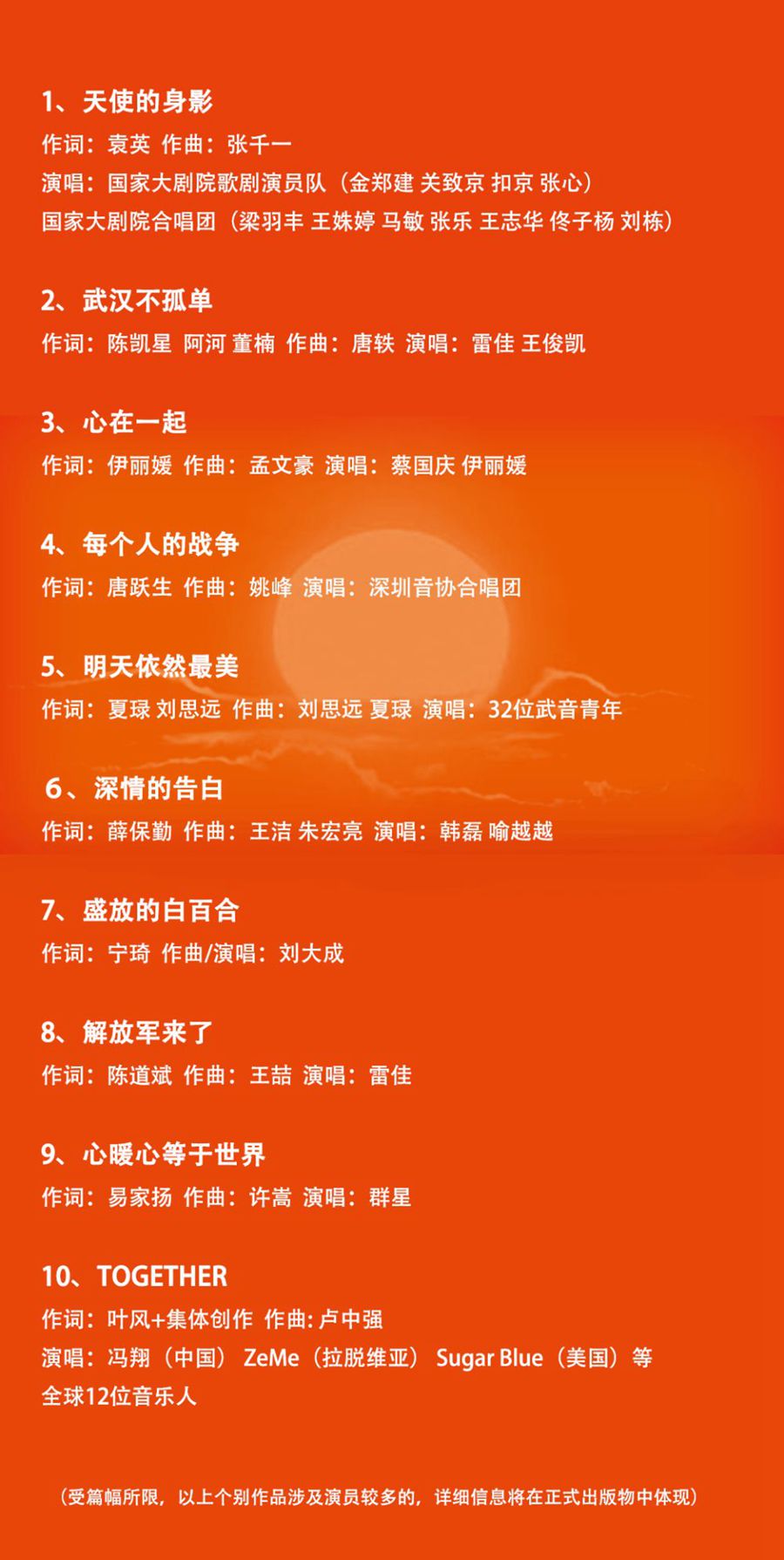 目前,第二批入選作品即將與聽眾見面。此次精選的10首抗疫優(yōu)秀主題歌曲,凝結(jié)社會(huì)各界的創(chuàng)作力量,包括各地音樂工作者、音樂院校、藝術(shù)院團(tuán)、專業(yè)音樂公司等,主要表現(xiàn)疫情防控工作進(jìn)入關(guān)鍵階段以來(lái),全國(guó)上下一盤棋,眾志成城決戰(zhàn)決勝武漢抗疫保衛(wèi)戰(zhàn)的堅(jiān)定決心和必勝信念。