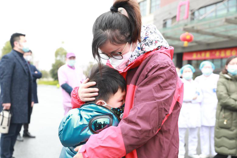 孫曉蘭緊緊摟住前來送行的兒子。江蘇南京醫(yī)科大學(xué)附屬逸夫醫(yī)院供圖