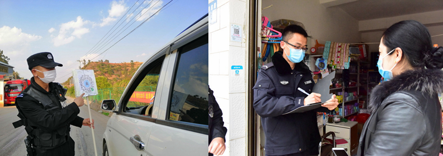 左圖為正在轄區(qū)疫情防控卡點(diǎn)值守的大兒子王麒灃;右圖為摸排轄區(qū)人員活動(dòng)軌跡的小兒子王杰暉。王春艷攝