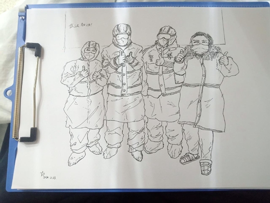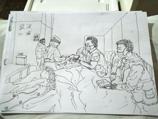 他把畫的“方艙生活”發(fā)到了微博上——兩位病人在床,護(hù)士俯身照顧。畫中醫(yī)院的墻上被他特意寫了四個字:“武漢加油。”(程盟超)