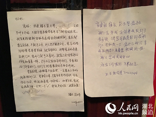 “這是我送給您的,不要錢!” 2月24日下午,湖北省宜昌市夷陵區(qū)小溪塔街道轉(zhuǎn)崗黨員彭玉琴來到金鳳朝陽小區(qū)4棟4樓的一家住戶門前,查看了門邊留言條上的內(nèi)容,掏出筆寫下了這句溫馨留言。