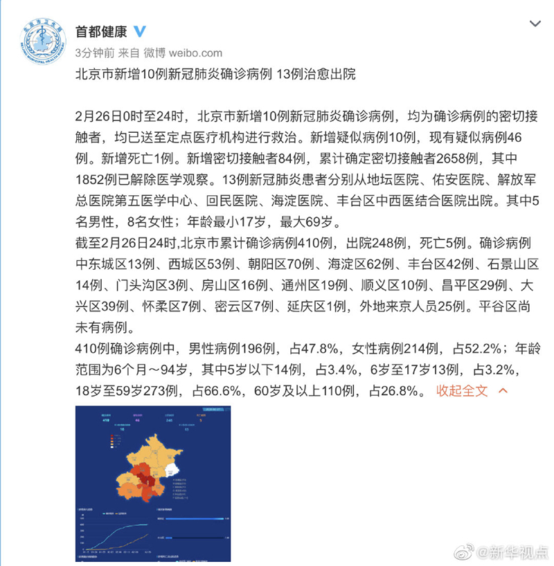 2月26日0時至24時,北京市新增10例新冠肺炎確診病例,均為確診病例的密切接觸者,均已送至定點醫(yī)療機構進行救治。新增疑似病例10例,現(xiàn)有疑似病例46例。新增死亡1例。新增密切接觸者84例,累計確定密切接觸者2658例,其中1852例已解除醫(yī)學觀察。13例新冠肺炎患者分別從地壇醫(yī)院、佑安醫(yī)院、解放軍總醫(yī)院第五醫(yī)學中心、回民醫(yī)院、海淀醫(yī)院、豐臺區(qū)中西醫(yī)結合醫(yī)院出院。其中5名男性,8名女性;年齡最小17歲,最大69歲。
