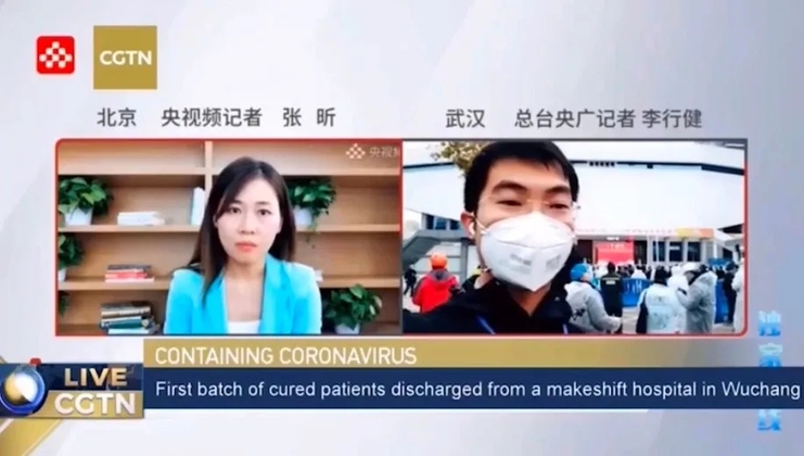 2月11日,中央廣播電視總臺中國之聲特別報道部記者李行健在武昌方艙醫(yī)院前與央視頻連線,并通過CGTN等平臺同步直播。