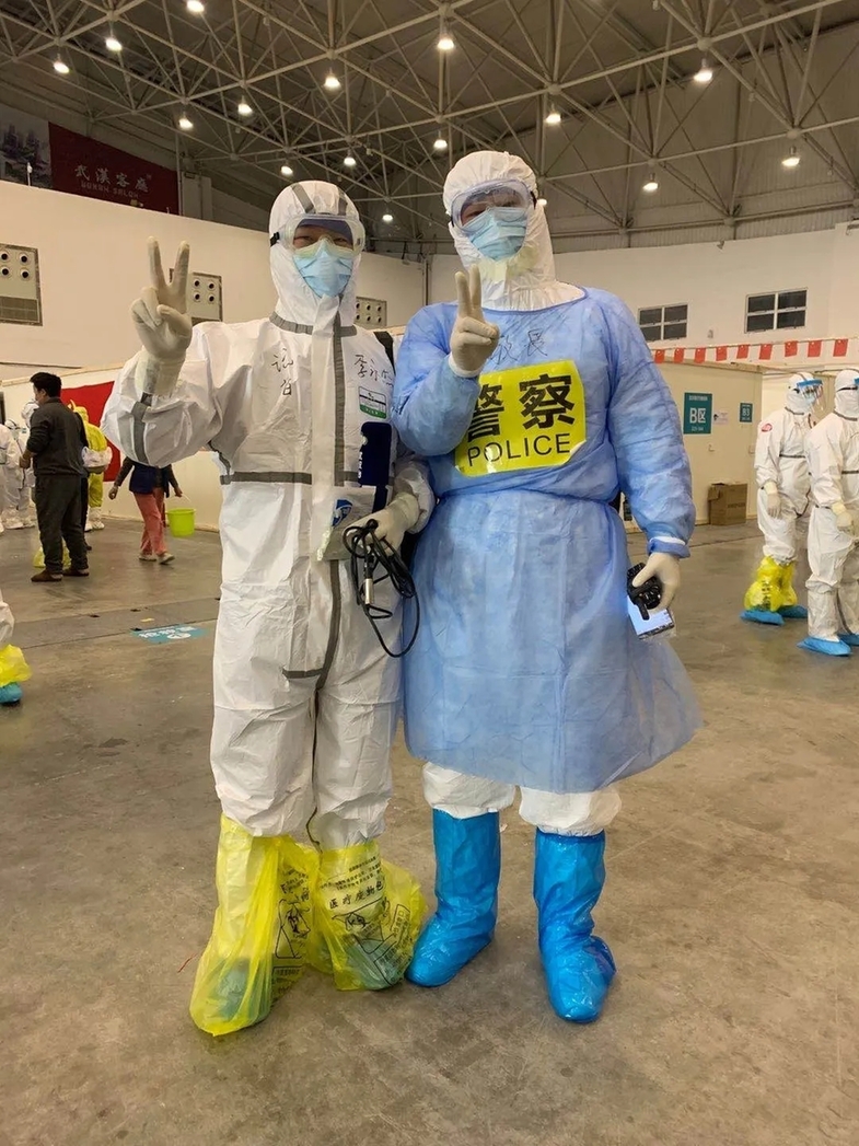 武漢廣播電視臺新聞頻道深度資訊部記者李永杰(左)在武漢客廳方艙醫(yī)院病區(qū)內(nèi)偶遇東西湖區(qū)交通大隊漢警快騎隊民警張敬畏。