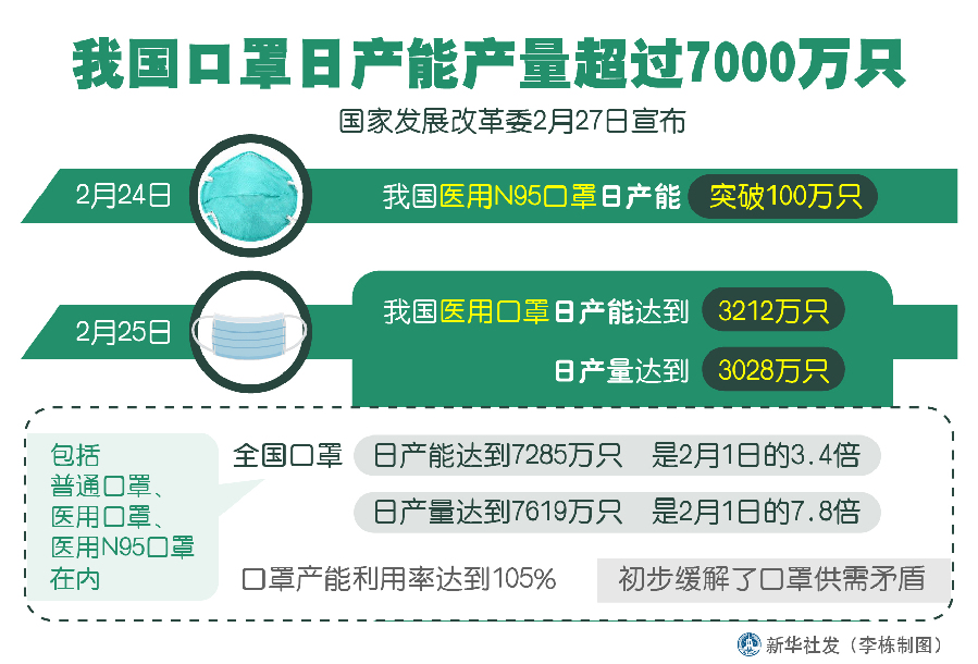 新華社北京2月27日電(記者安蓓)國(guó)家發(fā)展改革委27日宣布,繼2月24日我國(guó)醫(yī)用N95口罩日產(chǎn)能突破100萬(wàn)只后,2月25日,我國(guó)醫(yī)用口罩日產(chǎn)能達(dá)到3212萬(wàn)只,日產(chǎn)量達(dá)到3028萬(wàn)只;包括普通口罩、醫(yī)用口罩、醫(yī)用N95口罩在內(nèi),全國(guó)口罩日產(chǎn)能達(dá)到7285萬(wàn)只,日產(chǎn)量達(dá)到7619萬(wàn)只,分別是2月1日的3.4倍、7.8倍,口罩產(chǎn)能利用率達(dá)到105%,初步緩解了口罩供需矛盾。