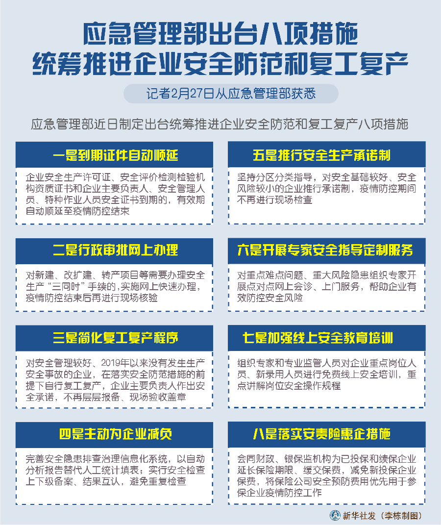 圖表:應(yīng)急管理部出臺八項措施 統(tǒng)籌推進企業(yè)安全防范和復(fù)工復(fù)產(chǎn) 新華社發(fā) 李棟 制圖