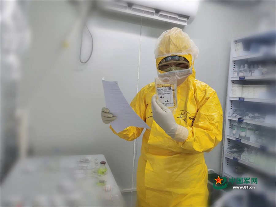 今天的主要任務是給18名病人抽血。這項平時對我來說簡單的不能再簡單的任務,此刻卻充滿了挑戰(zhàn)性。口罩、帽子、手套、防護服、護目鏡、防護面屏都給抽血帶來了極大的困難,呼出的熱氣讓護目鏡變得模糊,昏暗的燈光讓本就有限的視線變得更加不足,三層防護手套讓抽血也變得毫無手感。在抽血過程中,一個大媽問道:“姑娘,你們是來自部隊的么?”我看著她那親切的眼神,笑著點了點頭。大媽露出了信任的微笑,“有你們在,我就放心了。”這句話讓我的內(nèi)心久久不能平靜。