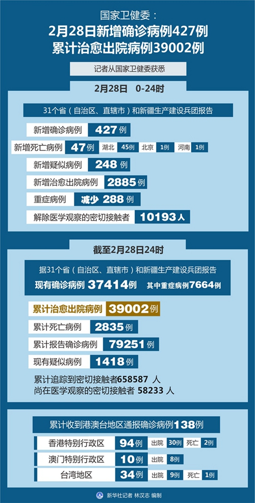 截至2月28日24時(shí),據(jù)31個(gè)?。ㄗ灾螀^(qū)、直轄市)和新疆生產(chǎn)建設(shè)兵團(tuán)報(bào)告,現(xiàn)有確診病例37414例(其中重癥病例7664例),累計(jì)治愈出院病例39002例,累計(jì)死亡病例2835例,累計(jì)報(bào)告確診病例79251例,現(xiàn)有疑似病例1418例。累計(jì)追蹤到密切接觸者658587人,尚在醫(yī)學(xué)觀察的密切接觸者58233人。