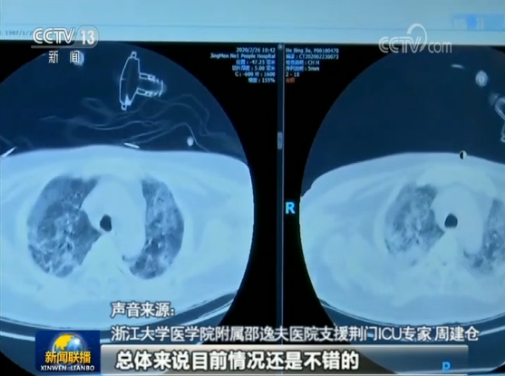 聲音來源:浙江大學(xué)醫(yī)學(xué)院附屬邵逸夫醫(yī)院支援荊門ICU專家 周建倉:左邊是26號的,右邊是23號的,肺部吸收還是比較明顯,總體來說目前情況還不錯(cuò)。