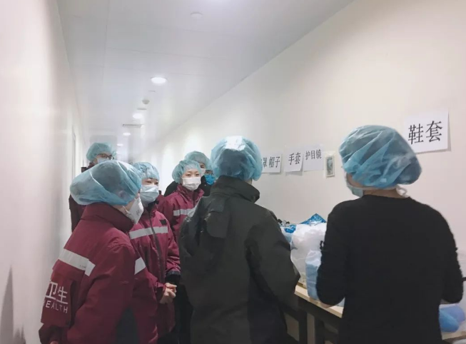 到了武漢大學(xué)人民醫(yī)院,我們在清潔區(qū)的通道里換防護(hù)服,洗手衣+防護(hù)服+隔離衣+自己的衣服,一共四層。再戴上兩個(gè)口罩和一個(gè)護(hù)目鏡。