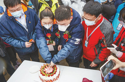雷神山醫(yī)院院方得知這對(duì)“95后”新人的情況后,為他們倆舉行了這場(chǎng)“戰(zhàn)地婚禮”。(姜泓冰、張赫、葉佳琪、莫佳瑜 記者 張武軍攝)
