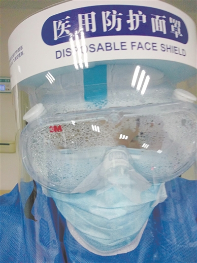 工作間隙,四川省第七批援鄂醫(yī)療隊隊員、核工業(yè)四一六醫(yī)院呼吸科護(hù)士向莉莉自拍下因汗水模糊的護(hù)目鏡。向莉莉供圖