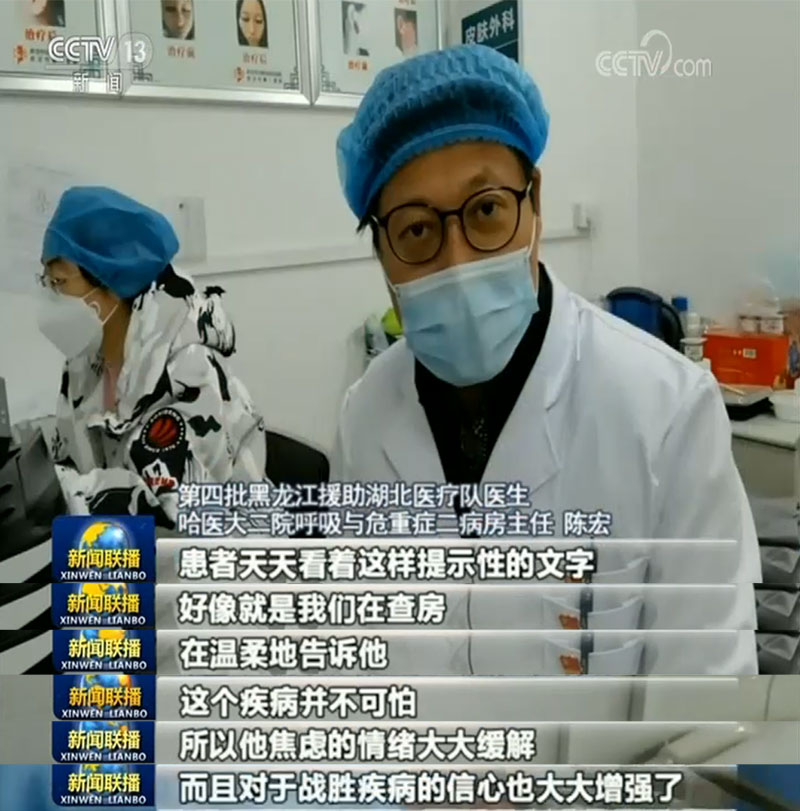 “繼續(xù)努力,早日出院”“新冠必?cái)?,您必勝”“?jiān)持就是勝利”,在武漢市第一醫(yī)院16樓重癥病區(qū),幾乎每位患者床頭都貼有一張寫(xiě)著鼓勵(lì)話語(yǔ)的淡粉色紙卡,而這些都出自前來(lái)支援的哈爾濱醫(yī)科大學(xué)附屬第二醫(yī)院呼吸科陳宏醫(yī)生之手。