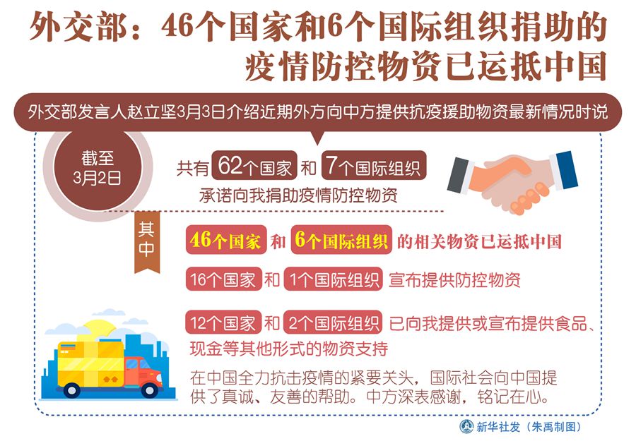 新華社北京3月3日電(記者朱超)外交部發(fā)言人趙立堅(jiān)3日介紹近期外方向中方提供抗疫援助物資最新情況時(shí)說,截至3月2日,共有46個(gè)國家和6個(gè)國際組織的相關(guān)物資已運(yùn)抵中國,中方深表感謝,銘記在心。