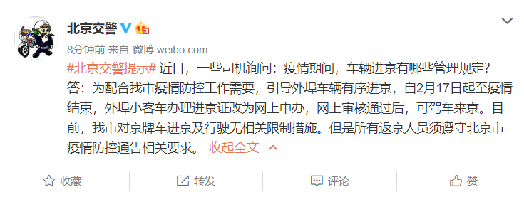 據(jù)北京市公安局公安交通管理局官方微博3月4日消息,近日,一些司機(jī)詢問:疫情期間,車輛進(jìn)京有哪些管理規(guī)定?答:為配合我市疫情防控工作需要,引導(dǎo)外埠車輛有序進(jìn)京,自2月17日起至疫情結(jié)束,外埠小客車辦理進(jìn)京證改為網(wǎng)上申辦,網(wǎng)上審核通過后,可駕車來京。目前,我市對京牌車進(jìn)京及行駛無相關(guān)限制措施。但是所有返京人員須遵守北京市疫情防控通告相關(guān)要求。
