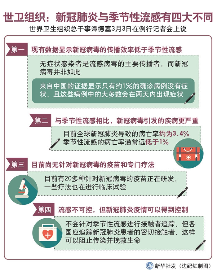 世界衛(wèi)生組織總干事譚德塞3日在例行記者會上說,世衛(wèi)組織正在加深對新冠肺炎的認(rèn)識,并發(fā)現(xiàn)它與季節(jié)性流感存在4個重要區(qū)別。