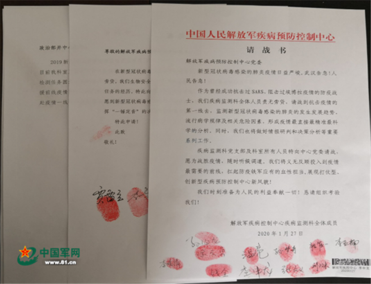 一份份斗志昂揚(yáng)的請戰(zhàn)書,一個(gè)個(gè)鮮艷奪目的紅手印,一顆顆無私無畏的赤子心,如一團(tuán)團(tuán)吞噬“疫魔”的烈火,凝聚在黨旗軍旗下,展現(xiàn)著軍隊(duì)疾控人信念如鐵、臨危不懼的赤膽忠心。