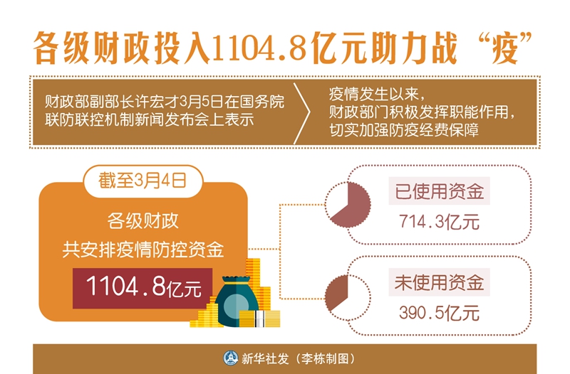 新華社北京3月5日電(記者申鋮、劉紅霞)財政部副部長許宏才5日在國務(wù)院聯(lián)防聯(lián)控機(jī)制新聞發(fā)布會上表示,疫情發(fā)生以來,財政部門積極發(fā)揮職能作用,切實加強防疫經(jīng)費保障,截至3月4日,各級財政共安排疫情防控資金1104.8億元。