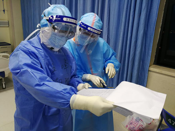 武漢協(xié)和醫(yī)院里,王峰和同事正一起查房。(受訪者供圖)