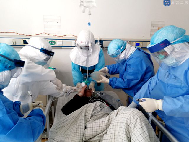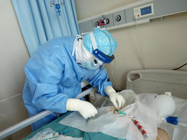 但病毒不會等你嚴(yán)陣以待再發(fā)動進(jìn)攻。病房完成改造的第二天,就有兩名患者出現(xiàn)緊急狀況,需要搶救性氣管插管。這是一場硬仗。操作過程中,患者氣道開放,醫(yī)生距離患者不到20厘米,被感染的風(fēng)險(xiǎn)非常大。整個(gè)過程必須在幾分鐘內(nèi)完成,稍有猶豫,患者就可能面臨生命危險(xiǎn)。