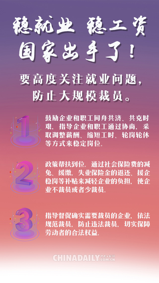 疫情沖擊之下,一些企業(yè)無(wú)法正常營(yíng)業(yè),現(xiàn)金流驟減,甚至歸零,但是各種費(fèi)用支出依然龐大,部分企業(yè)面臨生產(chǎn)經(jīng)營(yíng)困難,一些職工面臨待崗、失業(yè)、收入減少等風(fēng)險(xiǎn)……如何穩(wěn)就業(yè)、穩(wěn)工資?不要慌,國(guó)家已經(jīng)出手了!