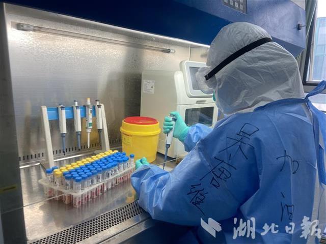 穿著防護(hù)衣、隔離衣、戴上口罩、護(hù)目鏡、面罩、三層手套、套上腳套等,這是進(jìn)入實(shí)驗(yàn)室之前的“標(biāo)準(zhǔn)動(dòng)作”?!按┖靡话阈枰胄r(shí)左右,獨(dú)立完成比較難,大家會(huì)互相幫助。被層層包裹后,動(dòng)作都會(huì)慢下來,連側(cè)個(gè)身彎個(gè)腰都不方便,”吳唐維介紹。為了加快檢測(cè)速度,大家通常七八個(gè)小時(shí)不會(huì)吃飯、喝水。
