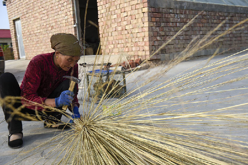 李耀梅在加固掃帚(2019年4月28日攝)。新華社發(fā)(馮開華 攝)