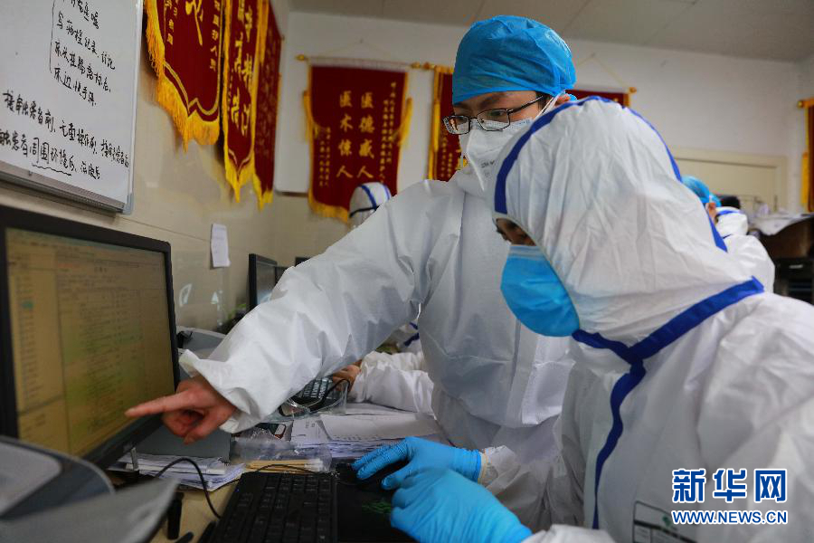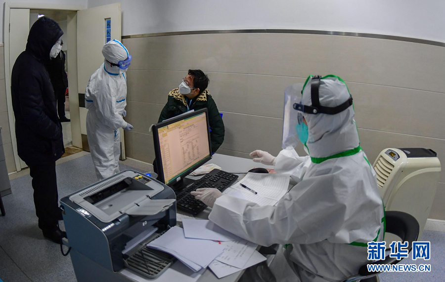 2月1日,在湖北省榮軍醫(yī)院發(fā)熱門診,醫(yī)生王琴(右一)和護(hù)士劉蕭(左二)接診發(fā)熱患者。 新華社發(fā)(劉中燦 攝)