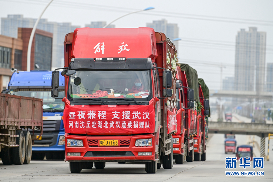 3月1日,河南沈丘退伍老兵王國輝帶隊(duì)第三次來到武漢送菜,將沈丘縣委縣政府采購的130噸農(nóng)副產(chǎn)品捐贈(zèng)給武漢。 新華社發(fā)(侯建勛 攝)