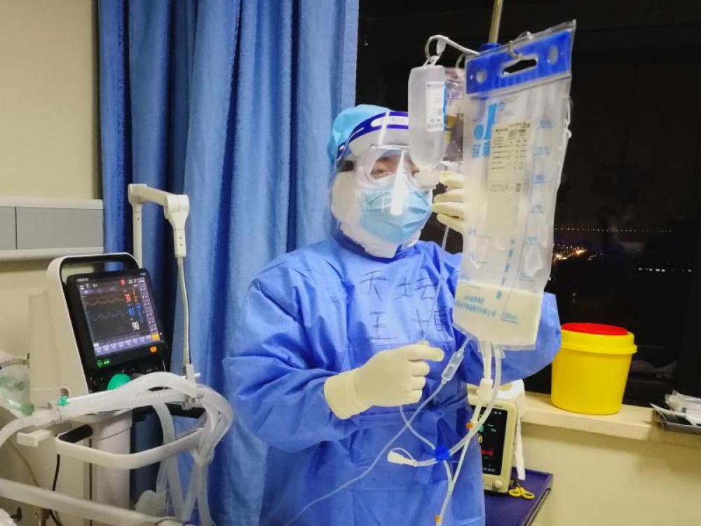 圖為北京天壇醫(yī)院支援武漢醫(yī)療隊(duì)王博和同事在工作中。