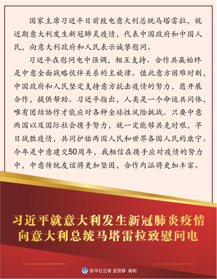 習(xí)近平在慰問電中強(qiáng)調(diào),相互支持、合作共贏始終是中意全面戰(zhàn)略伙伴關(guān)系的主旋律。值此意方困難時(shí)刻,中國政府和人民堅(jiān)定支持意方抗擊疫情的努力,愿開展合作,提供幫助。習(xí)近平指出,人類是一個(gè)命運(yùn)共同體,唯有團(tuán)結(jié)協(xié)作才能應(yīng)對(duì)各種全球性風(fēng)險(xiǎn)挑戰(zhàn)。只要中意兩國以及國際社會(huì)攜手努力,就一定能夠共克時(shí)艱,早日戰(zhàn)勝疫情,共同護(hù)佑兩國人民和世界各國人民的康寧。今年是中意建交50周年,我相信在攜手應(yīng)對(duì)疫情的努力中,中意傳統(tǒng)友誼將更加堅(jiān)固,合作內(nèi)涵將更加豐富。