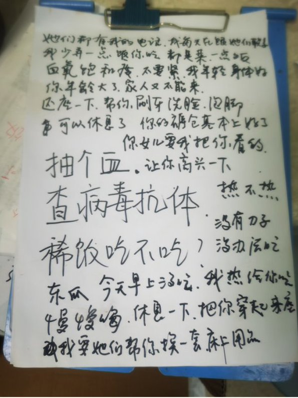 最初嘗試與秦奶奶交流時(shí),即使我們很大聲地說話,她還是一臉茫然地看著我們。得知秦奶奶聽力不佳及能識字的狀況后,護(hù)士們就把要對她說的話寫在紙上來和她溝通。