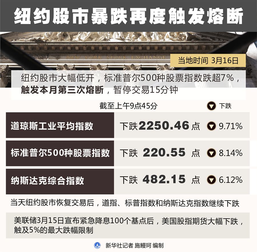 由于新冠肺炎疫情在美國持續(xù)擴散引發(fā)市場廣泛擔憂,紐約股市16日開盤暴跌,并再次觸發(fā)7%的熔斷點。交易重啟后跌幅擴大,收盤時紐約股市三大股指均暴跌超過11%。