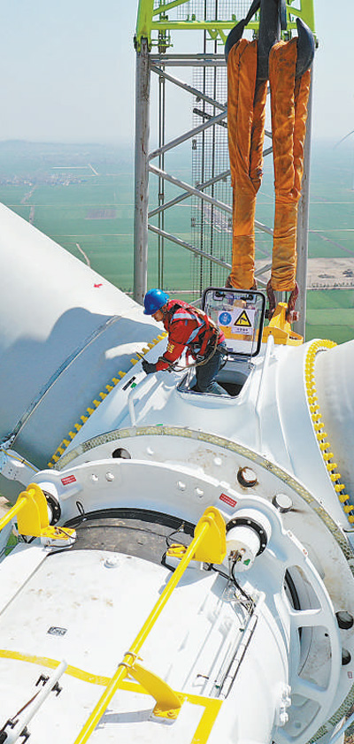 3月15日,在安徽省亳州市蒙城縣,華能風電項目復工后的第七臺風機順利吊裝。胡衛(wèi)國攝(影像中國)