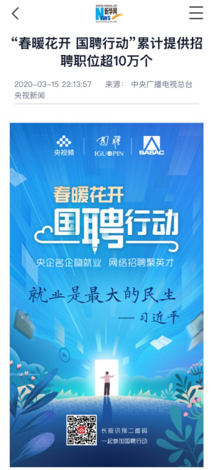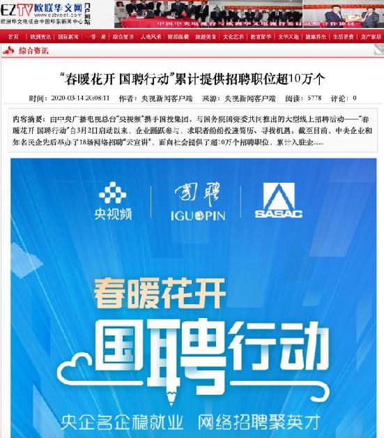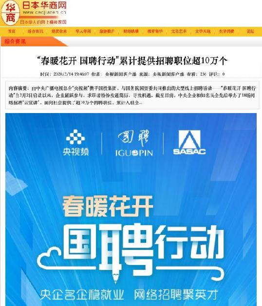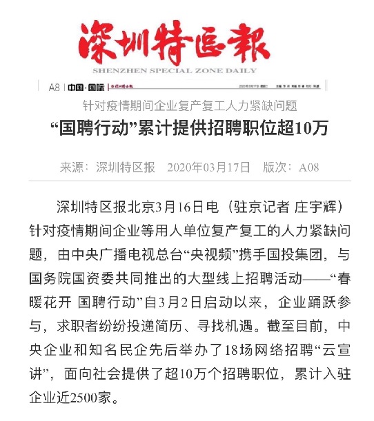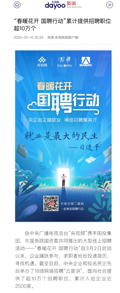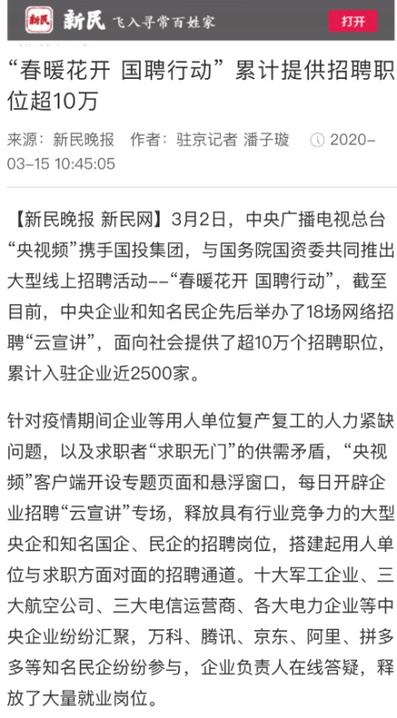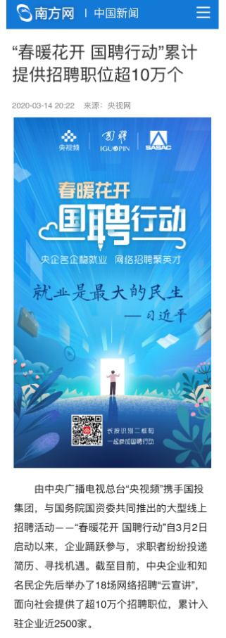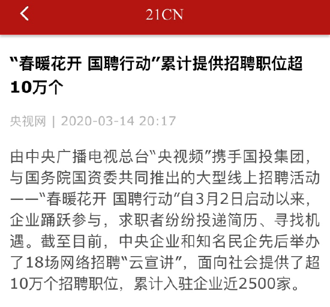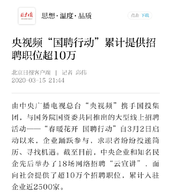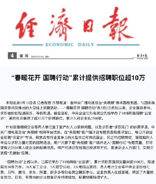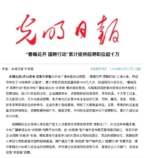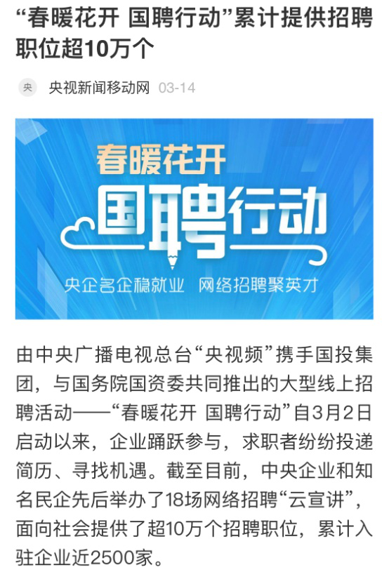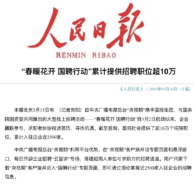 由中央廣播電視總臺(tái)“央視頻”攜手國(guó)投集團(tuán),與國(guó)務(wù)院國(guó)資委共同推出的大型線上招聘活動(dòng)——“春暖花開(kāi) 國(guó)聘行動(dòng)”,自3月2日啟動(dòng)以來(lái),企業(yè)踴躍參與,求職者紛紛投遞簡(jiǎn)歷。截至3月14日已面向社會(huì)提供了超10萬(wàn)個(gè)招聘職位,累計(jì)入駐企業(yè)近2500家,引發(fā)眾多媒體和網(wǎng)站轉(zhuǎn)載報(bào)道。