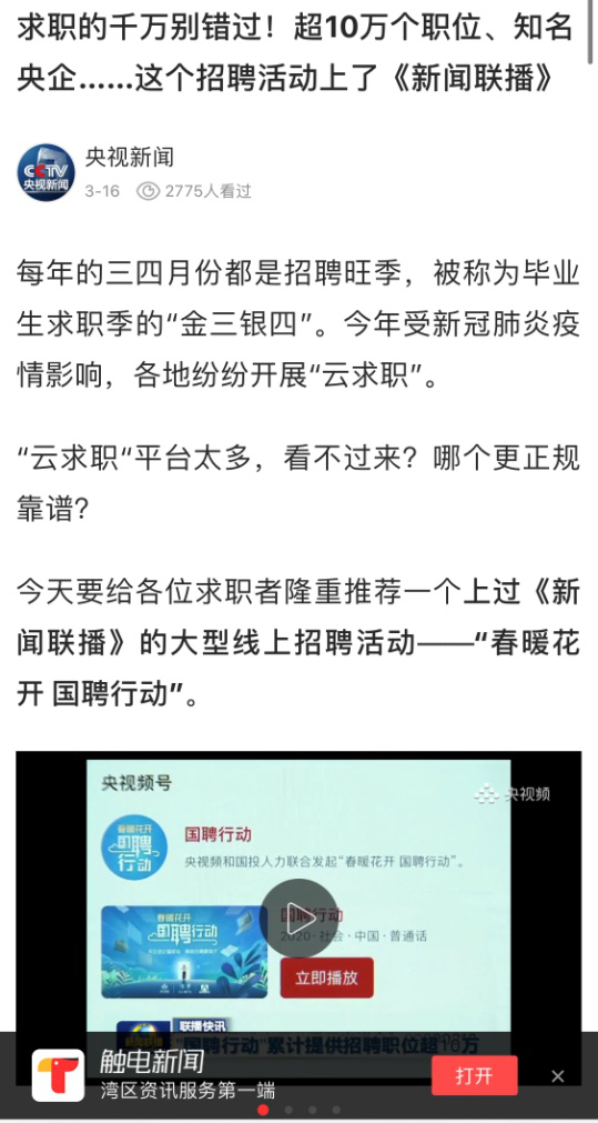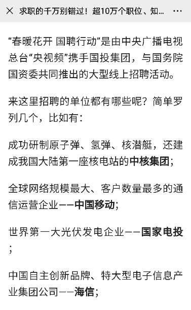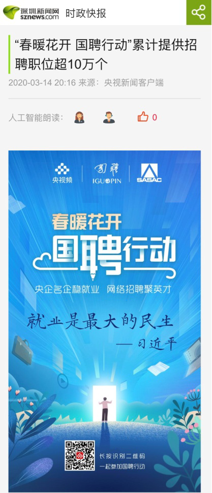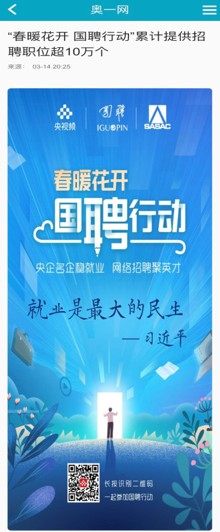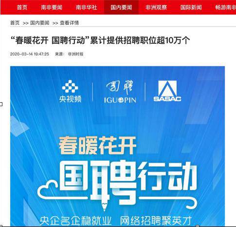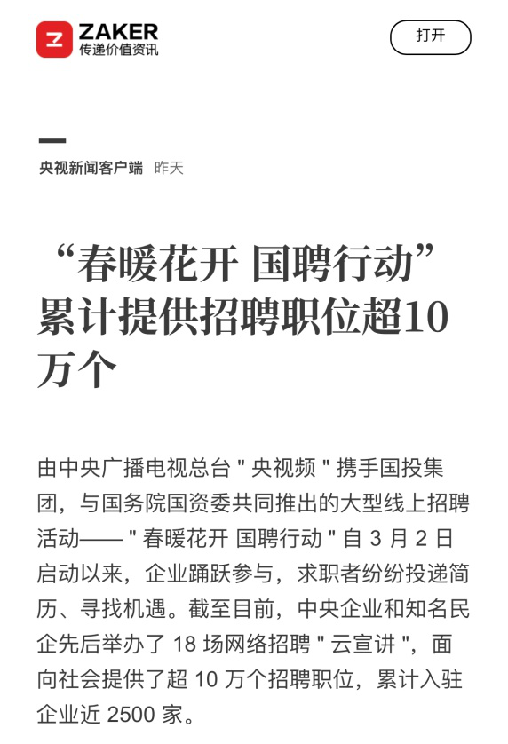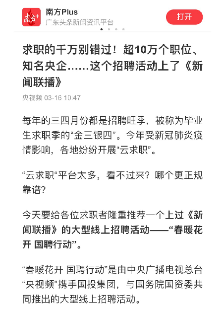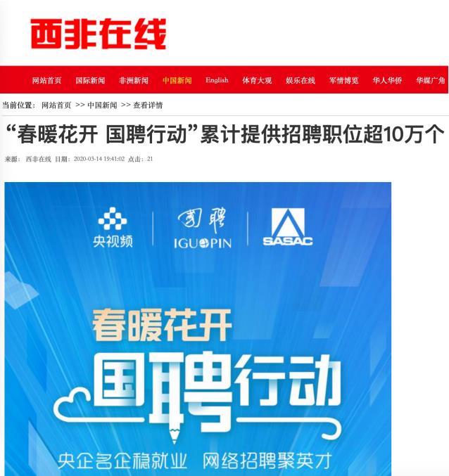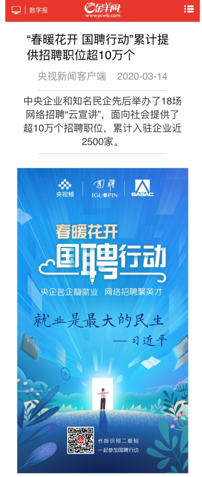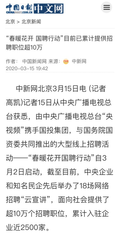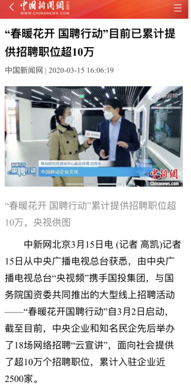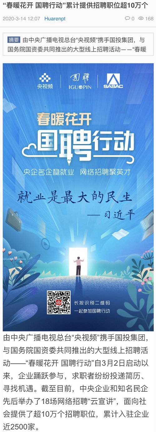 由中央廣播電視總臺(tái)“央視頻”攜手國(guó)投集團(tuán),與國(guó)務(wù)院國(guó)資委共同推出的大型線上招聘活動(dòng)——“春暖花開(kāi) 國(guó)聘行動(dòng)”,自3月2日啟動(dòng)以來(lái),企業(yè)踴躍參與,求職者紛紛投遞簡(jiǎn)歷。截至3月14日已面向社會(huì)提供了超10萬(wàn)個(gè)招聘職位,累計(jì)入駐企業(yè)近2500家,引發(fā)眾多媒體和網(wǎng)站轉(zhuǎn)載報(bào)道。